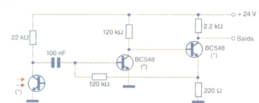 A way to avoid the influence of ambient light, or even the action of external light sources on the detector circuit, is to use modulated light. The resulting signal from a sensor circuit such as the one shown in the following figure is a tone with the same frequency as that used in the modulation and can be applied to a PLL for detection or to a recognition circuit of another type, including those that use DSPs. In the indicated circuit, the 22 kΩ resistor in series with the sensor can be changed depending on the desired sensitivity. The phototransistor used must be of a type chosen according to the application, but in general common types such as the TIL78 allow operation with modulated signals of up to a few hundred kilohertz. The complete circuit for this application is in the figure.