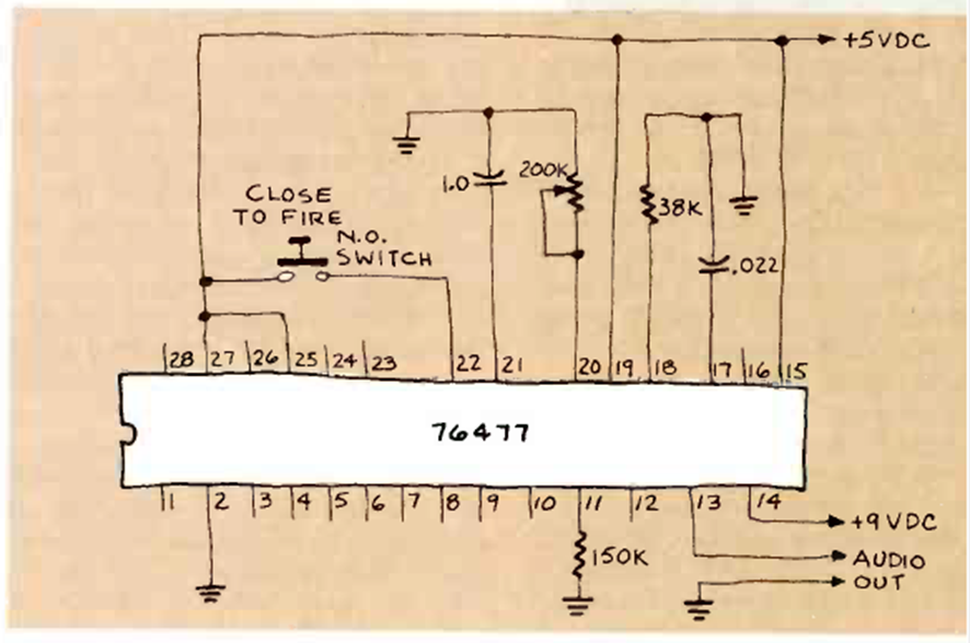 Using an integrated effects circuit, this circuit produces gunshot sound. The circuit must be powered by 5 V and the signal applied to a good audio amplifier.