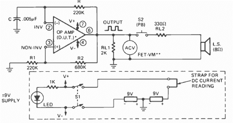This circuit was found in the September 1974 issue of Radio Electronics magazine. It consists of a simple oscillator that is used to test operational amplifiers. It generates an audio signal if the operational amplifier is good.