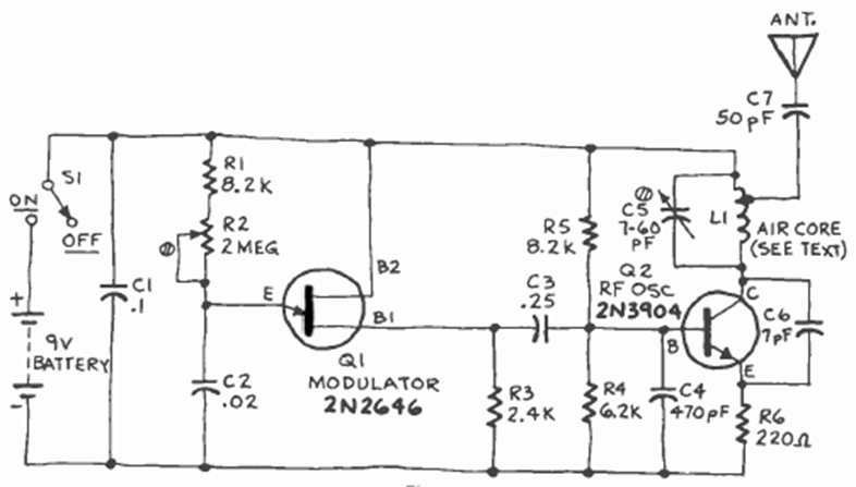 This circuit can send signals in both the VHF and FMN bands with a range of a few tens of meters. The circuit is from Radio Electronics from December 1980. For the FM band the coil has 4 + 4 turns of 26 or 28 wire with 0.5 cm diameter without a core.