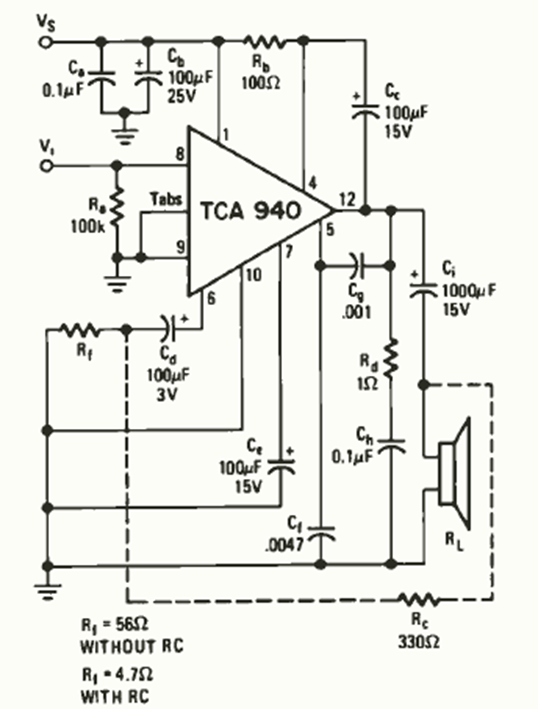 This few-watt amplifier was found in the August 1975 issue of Radio Electronics magazine. The circuit was used in many commercial devices of the time. Cc determines the gain.