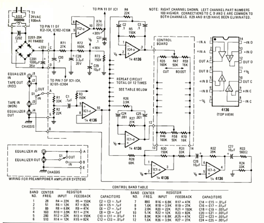 This equalizer was found in the May 1978 issue of Radio Electronics magazine. The component values for the equalization networks are given next to the diagram.