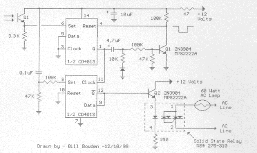 Recommended for controlling a projector, this circuit was found in documentation from the 80s. The circuit uses an optical coupler to control a triac. The sensor is a common phototransistor.