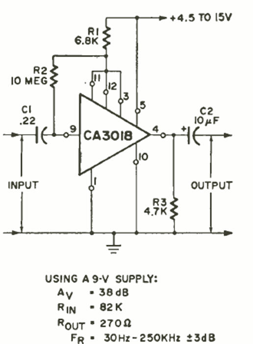 Using the RCA CA3018 integrated circuit, this amplifier was found in an article in the August 1970 Radio Electronics magazine. The circuit characteristics are given next to the diagram.