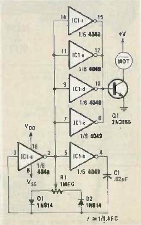 Using the CMOS 4046 IC this motor control was found in November 1984 Radio Electronics magazine. The maximum motor current depends on the transistor and can reach more than 3 A as in this case.
