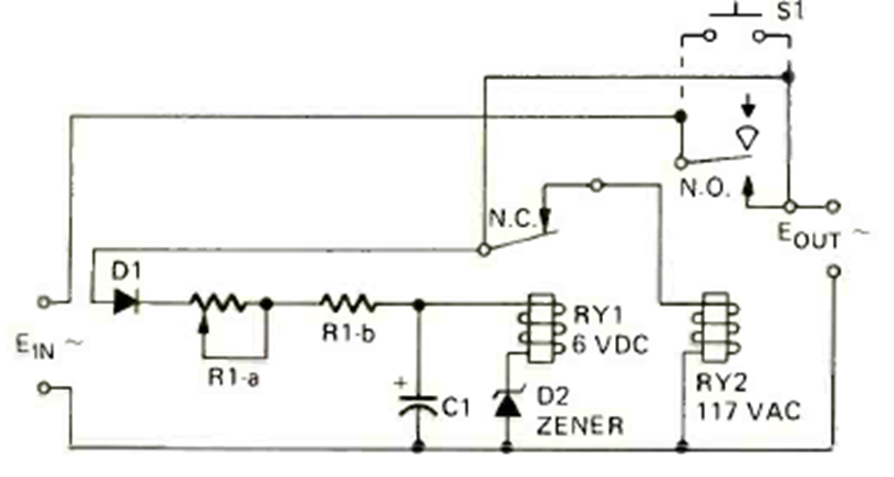 This circuit uses two relays that switch when the voltage exceeds the value given by zener D2. The circuit is from a Radio Electronics magazine from April 1975.