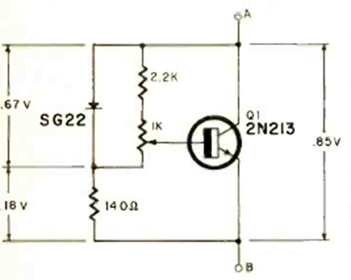 This circuit simulates a diode whose characteristics can be adjusted with a trimpot. The circuit is from a Radio Electronics from December 1971 and is used for circuits in which the diode is a critical component, such as the biasing of amplifiers.