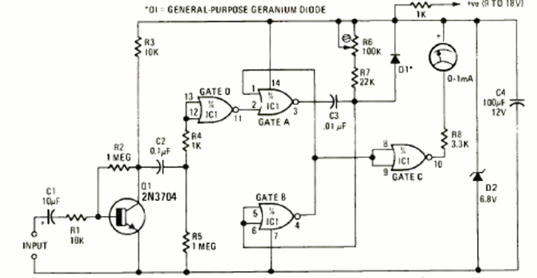Using a CMOS 4001, this circuit provides frequency readings on an analog instrument. The idea of the original article in April 1976 Radio Electronics magazine is to use it in a tachometer, but it works with sinusoidal signals as well.