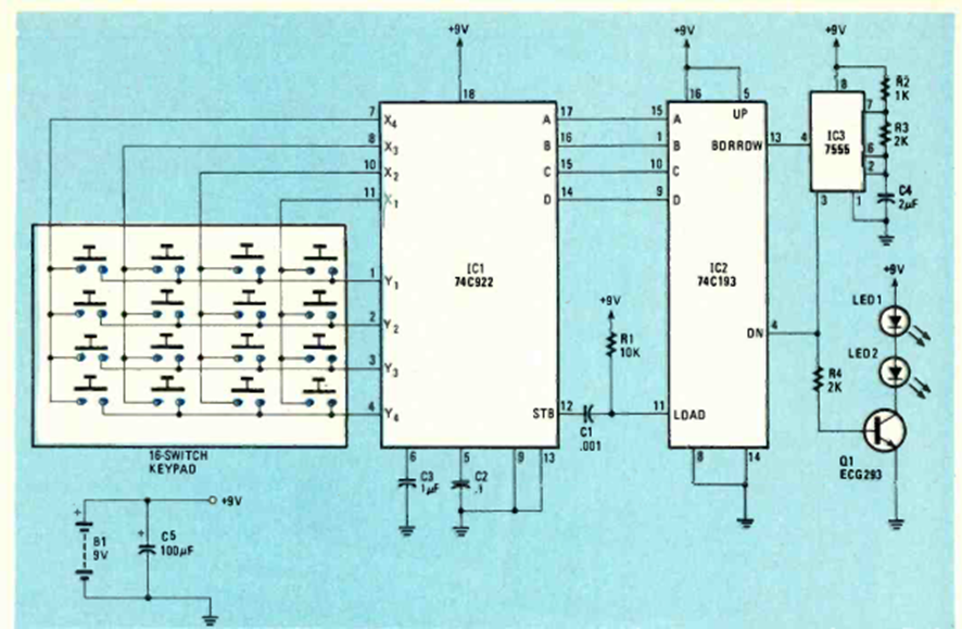 This circuit for a 16-channel infrared transmitter was found in the August 1984 issue of Radio Electronics magazine. The circuit is powered by a 9 V battery.