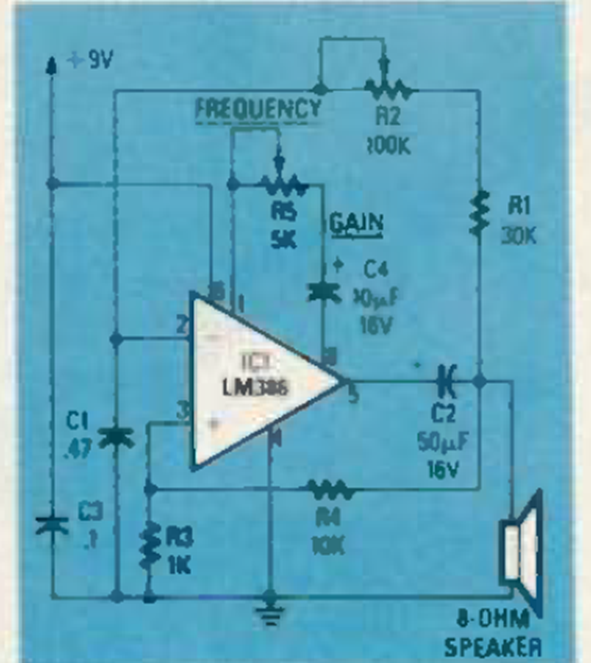 Circuits like this one, using the LM386 audio amplifier, are available from other sources in this same section. This one is from the August 1986 Radio Electronics magazine.