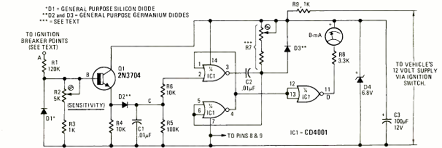 The speed indication of this circuit is made on an analog instrument. The circuit is used to count pulses (rpm) and was found in April 1976 Radio Electronics magazine.