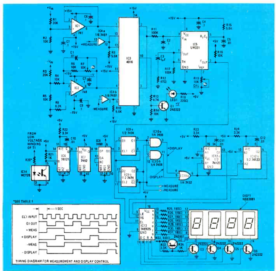 We found this circuit in the February 1983 issue of Radio Electronics magazine. The 4-digit circuit is based on dedicated integrated circuits of the time. The power supply is not shown.