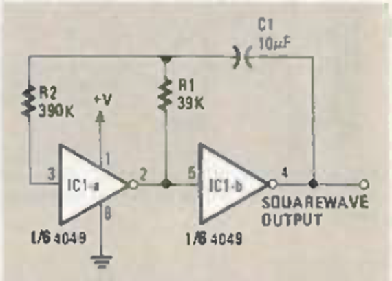 This circuit appeared in Radio Electronics in November 1984. The frequency depends primarily on C1. The signal generated is rectangular.