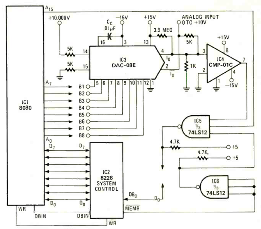 The figure shows how to use an 8080 in a digital to analog converter. The circuit is from a Radio Electronics from February 1978. The other components are from that time, except for the TTL.