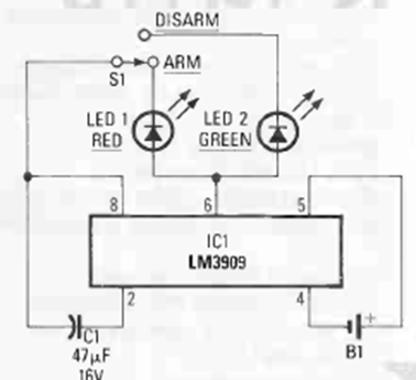 The flashing LEDs on this circuit, published in the 1989 Radio Electronics Experimenter, make you think it's an alarm, scaring away potential thieves.