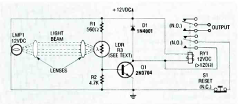 This simple optical alarm circuit was found in the 1991 Electronics Experimenter Handbook. The circuit uses a lamp as the emitter but can use LEDs.
