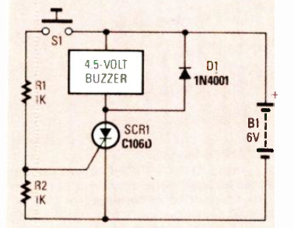 This circuit was found in a September 1987 Radio Electronics. The current through the switch is very low and the circuit is for a buzzer that has self-interrupting capabilities.