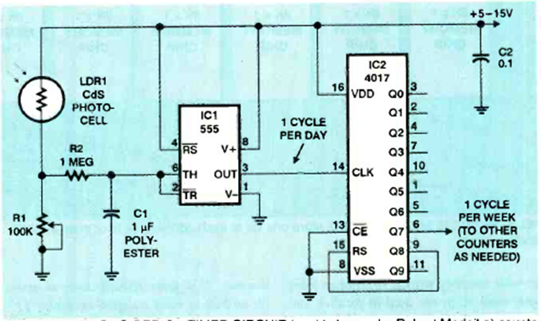 This circuit uses sunrise and sunset as a synchronization signal. The circuit is from Electronics Now magazine from May 1999. The cycle is one pulse per week.