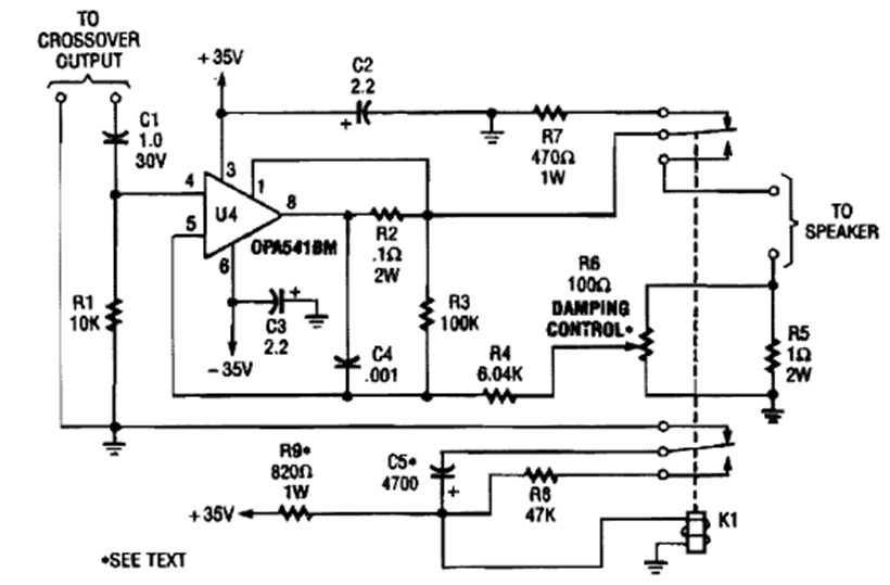 Found in a Popular Electronics from the 90s, this circuit provides 100 W of power. The power supply is from a 25V source and the integrated circuit must be equipped with a heatsink.