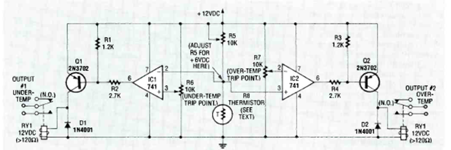 We found this circuit that uses a thermistor as a sensor from the 1991 Electronics Experimenter Handbook. The circuit drives independent relays and is powered by voltage according to the relays.