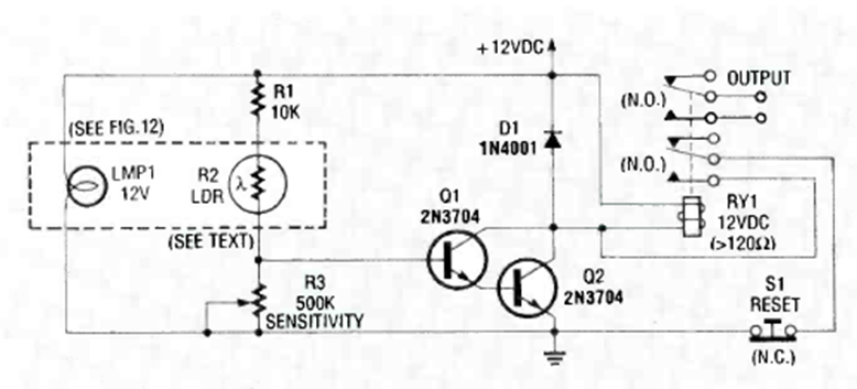 This circuit was found in the 1991 Electronics Experimenter's Handbook. It activates a relay when light shines on a sensor.