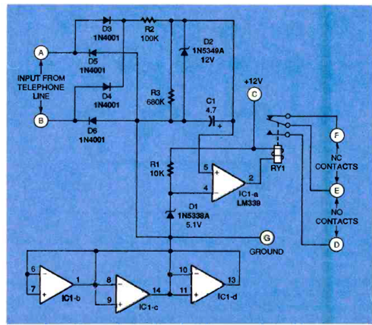 This circuit for old telephone lines was found in the March 1997 issue of Electronics Now magazine. The circuit drives a relay based on the voltage monitored on the line.