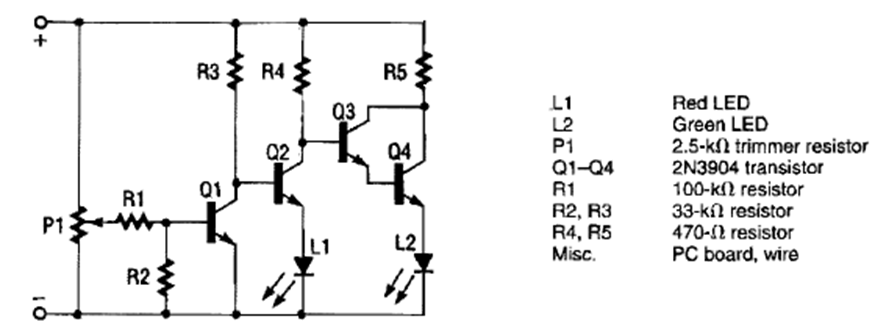 This automotive grade circuit was found in a 1991 Electronics Hobbyist. The transistors are general purpose types. P1 sets the monitoring voltage.