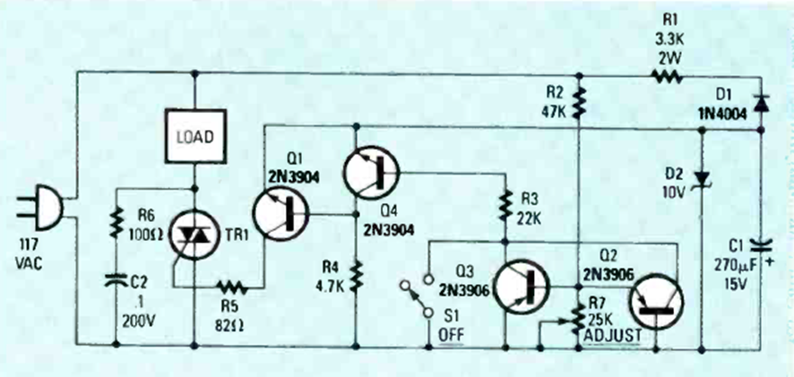 In this circuit the triac conducts when switch S1 is opened. We found it in the October 1987 Radio Electronics magazine. The triac is controlled according to the load.