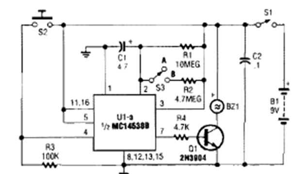 This circuit emits a sound at regular intervals to prevent you from falling asleep, for example. It can be found in the Encyclopedia of Electronic Circuits Volume 5 from 1995.