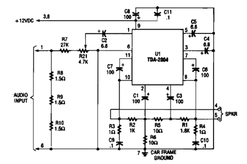 This car audio amplifier was found in a Popular Electronics Hobbyist Handbook from the 1990s. The circuit uses the TDA2004 to boost the car radio output of cars of the time.