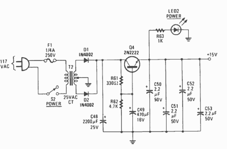 This simple 15 V power supply was found in an article describing an assembly in the January 1987 Radio Electronics magazine. The power supply is used to power the circuit described.