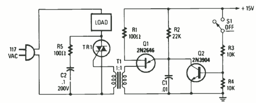 We found this circuit in the October 1987 Radio Electronics magazine. The circuit uses a 1-to-1 turns ratio pulse transformer to trigger the Triac.