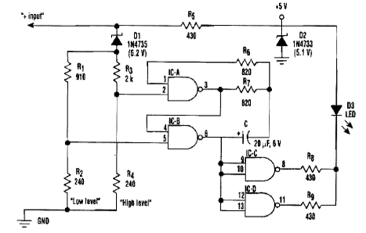 Based on CMOS logic gates, this circuit was found in an Electronic Design from the 90s. The circuit is for voltages from 11 to 15V, but it can be changed,