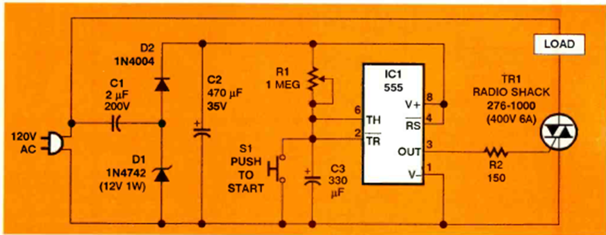 We found this circuit in the January 1997 Electronics Now magazine. The triac determines the maximum controlled power. The time is set by R1. It is recommended to connect a 10k resistor in series with the potentiometer.