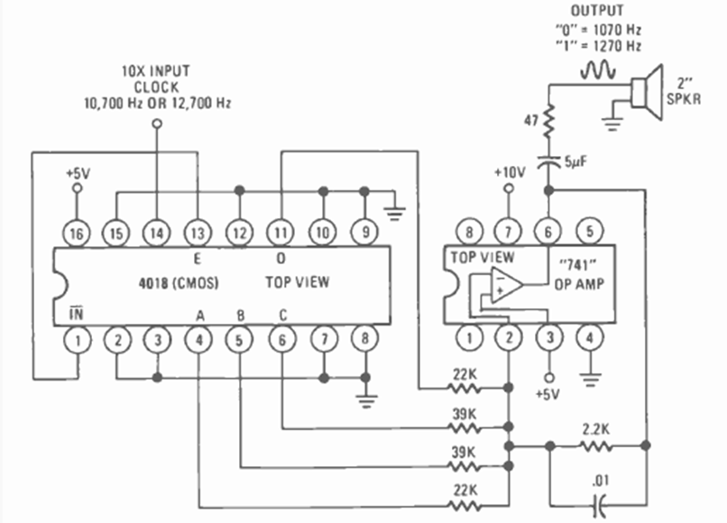 This CMOS generator with the 4018 IC was found in a November 1976 Radio Electronics magazine. It uses a 741 op-amp as the audio amplifier.