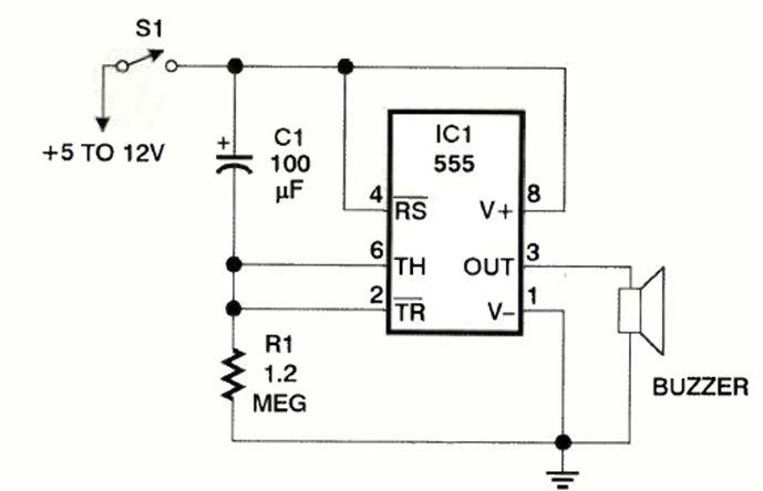 This is the basic configuration to excite a ceramic buzzer with the 555 that will ring at a 2-minute interval. We found it in the Electronics Now magazine of November 1997. The buzzer is of the oscillator type.
