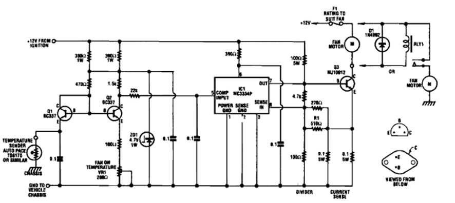 This circuit for cars with fans was found in Silicon Chips documentation from the 90s. It is used to activate the fan when the radiator water temperature rises.