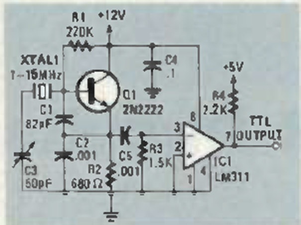 This TTL-compatible circuit was found in the December 1986 issue of Radio Electronics magazine. The crystal determines the frequency of the signal produced.
