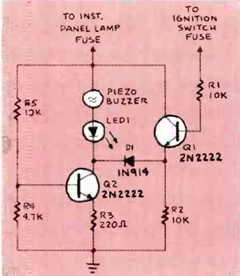 The purpose of this circuit is to warn the driver when he turns off the car while leaving the headlights on. The circuit is from a Radio Electronics from April 1987.