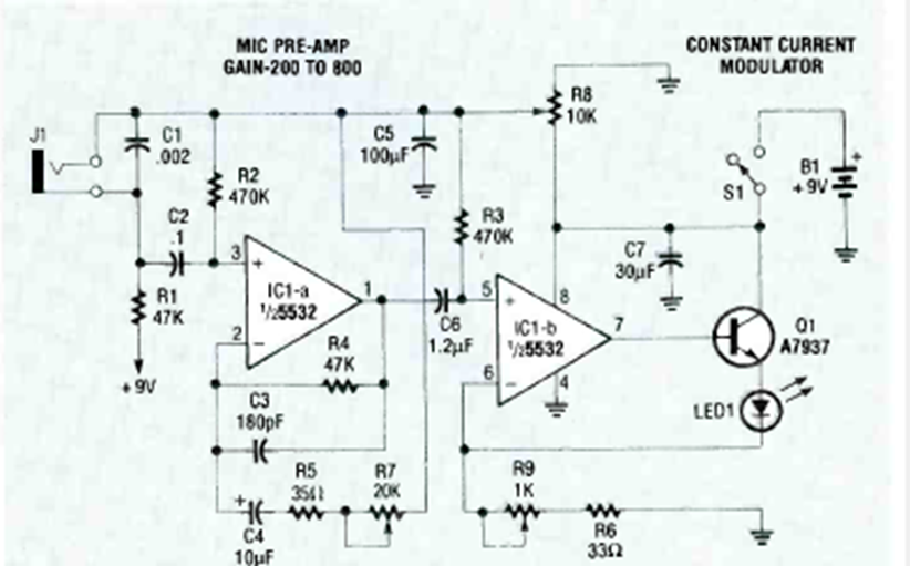 This modulated transmitter for a light beam communication system was found in the 1991 Electronics Experimenter Handbook. The circuit modulates a LASER diode.