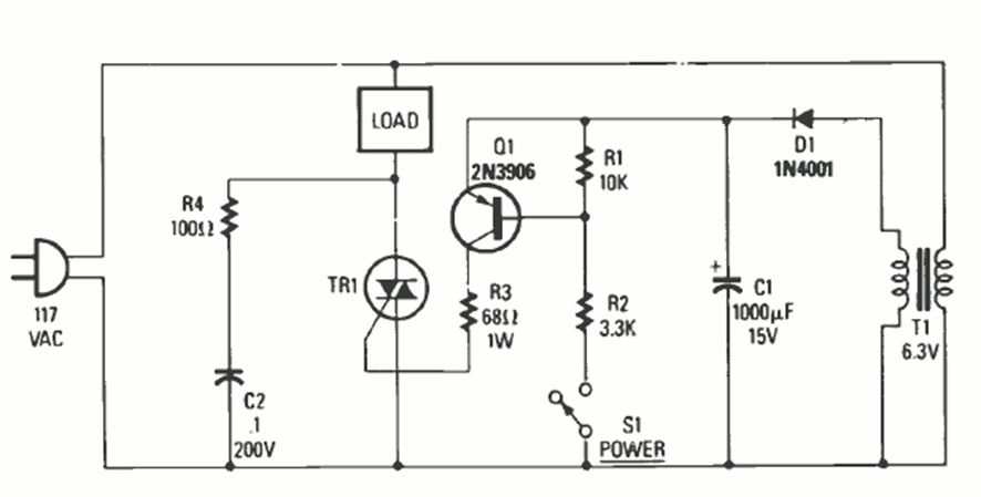 The maximum power of the controlled load depends on the triac used. The circuit is from a Radio Electronics from October 1987. The transformer is a low current transformer with 100 mA or more of current.