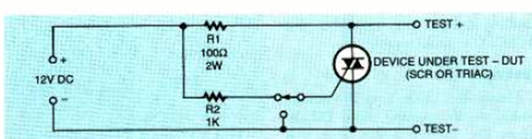 This circuit is used to test triacs. It can be connected in series with a resistive load such as an incandescent light bulb. The circuit was suggested by Electronics Now magazine in November 1999.