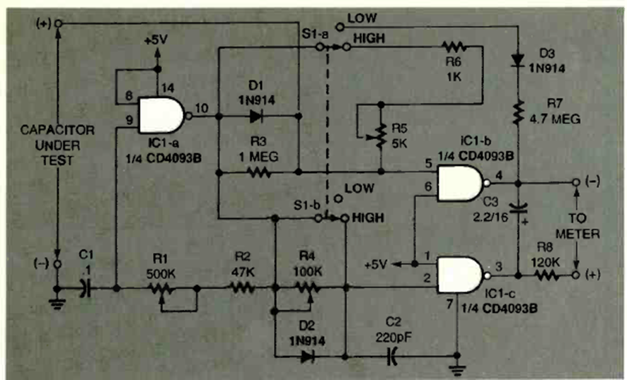 This circuit was originally designed to measure capacitance with an ICL7107 but can be used with other digital modules. The circuit is from Electronics Now magazine from November 1996.