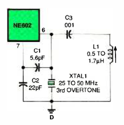 This oscillator reaches 50 MHz with an overtone crystal. The circuit is from Electronics Now magazine from February 1997.