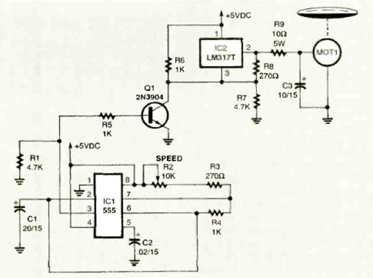 For experiments with a disk rotating at various speeds, the April 1998 Electronics Now magazine suggests this PWM motor control. The current with the LM317 is 1.5A maximum.