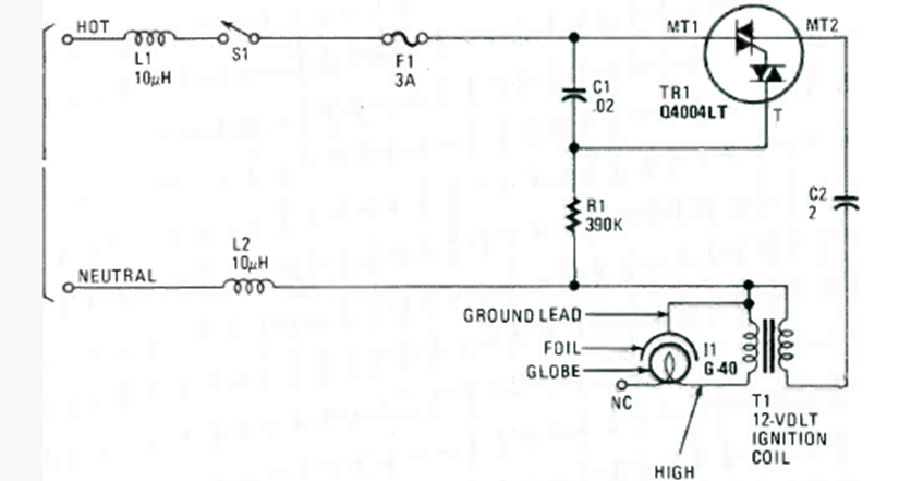 We found this circuit in a Radio Electronics Experimenter from 1990. The circuit uses a common incandescent bulb and a car ignition coil.