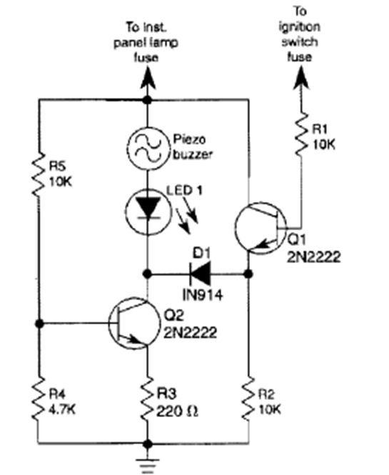 Found in the Radio Experimenter Handbook in a 1986 edition, this circuit warns when the car's high beams are on and the car turns off. The circuit uses common components.