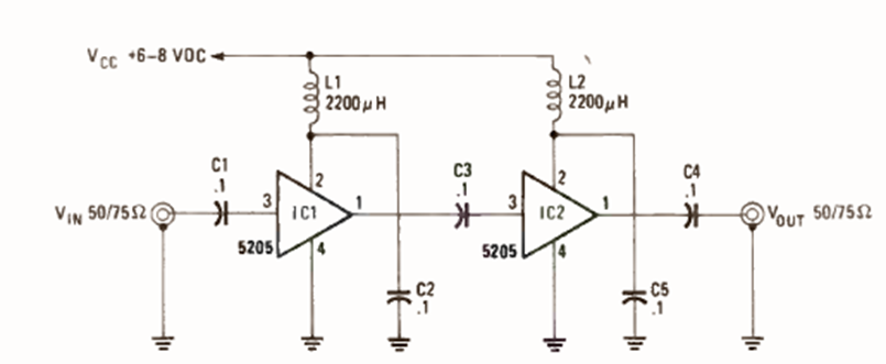 Using the NE5205 integrated circuit this circuit was found in the May 1987 issue of Radio Electronics magazine. It can amplify signals up to 450MHz.
