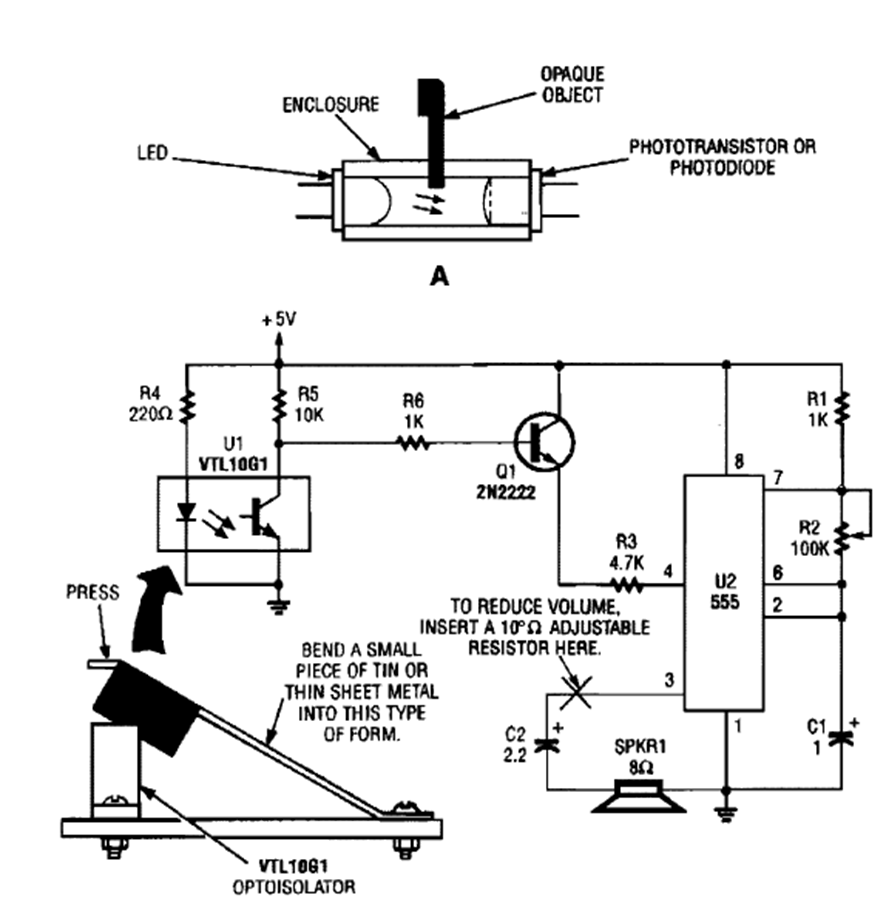 This ingenious circuit was found in a 1990s Popular Electronics. The oscillator is a 555 and the keyer uses an optocoupler in the configuration shown.
