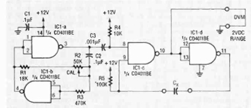 Found in a 1993 Electronics Experimenter Handbook, this circuit uses a multimeter to measure capacitance. The circuit is powered by 12 V.